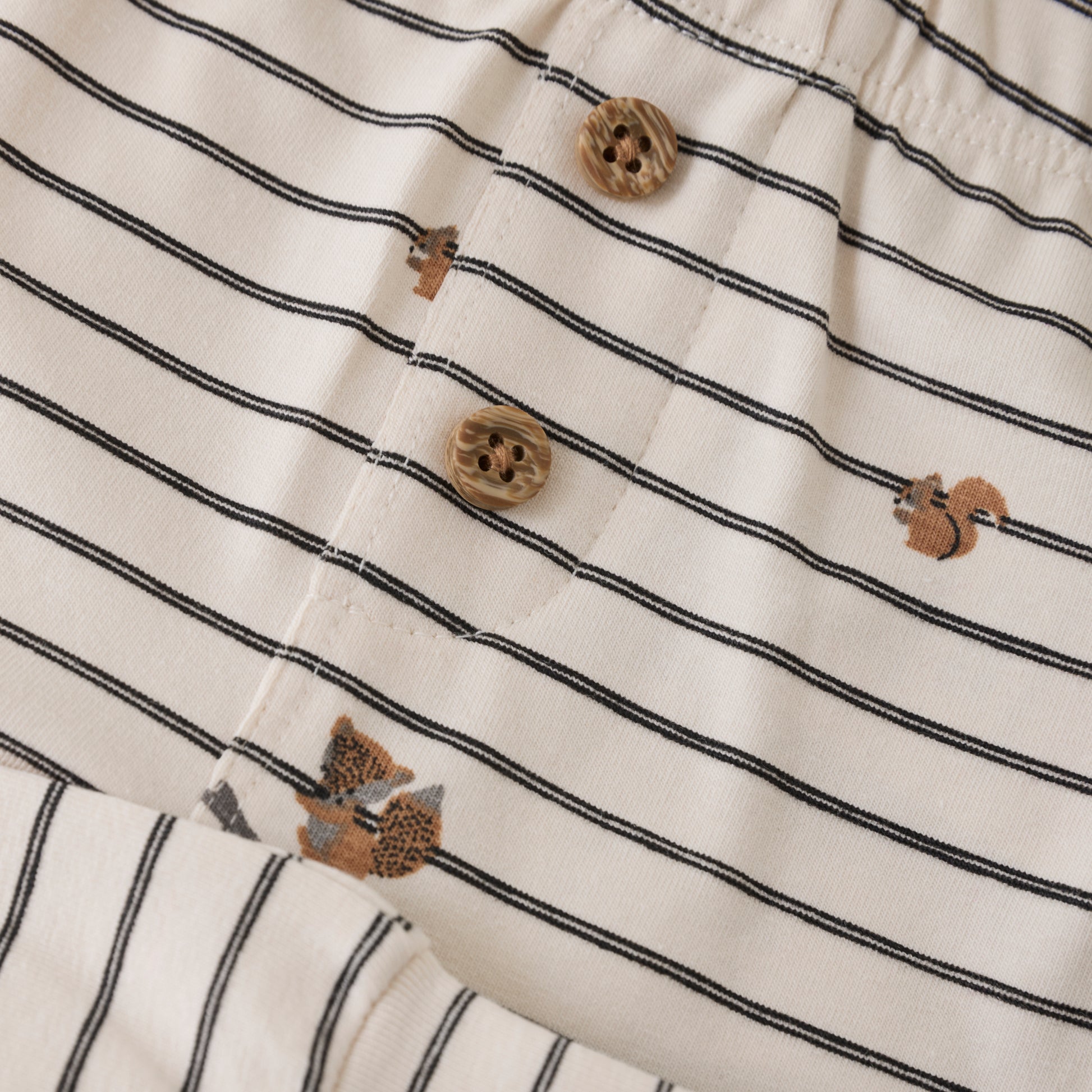 Pants with stripes and a cute animal motif on the front. Featuring an elastic waistband and a decorative faux fly with buttons.